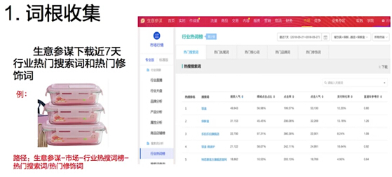 之前组建的还有另外一个表,热门修饰词,把热门修饰词复制到工具箱里面的热词词根表,只需复制词,不需要数据。当把词跟复制完成后,对应的搜索人气和点击人气就会自动匹配出来,这是根据500热搜词而来。接下来是一个优化的步骤,根据点击人气做一个降序排列,删除重复词根,再删除与自己产品不相关的词,属性不相干、风格不相关等等;最小词根的拆除词也要去掉,例如保鲜盒拆出的“保”“鲜”,“保鲜”本身是一个属性词,把保鲜二字再进行拆分就没有太大意义,我们要保证最小单位的词根。